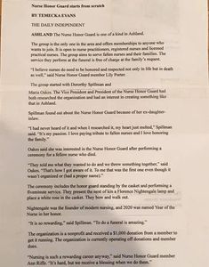 The group started with Maria Oaks and Dorothy Spillman. The President and the Vice President of the Nurse Honor Guard had both researched the organization and had an interest in creating something like that in Ashland, Kentucky. The group was formed in October of 2019 and have honored 278 nurses and their families as March 2025 including two of our very own founding members,